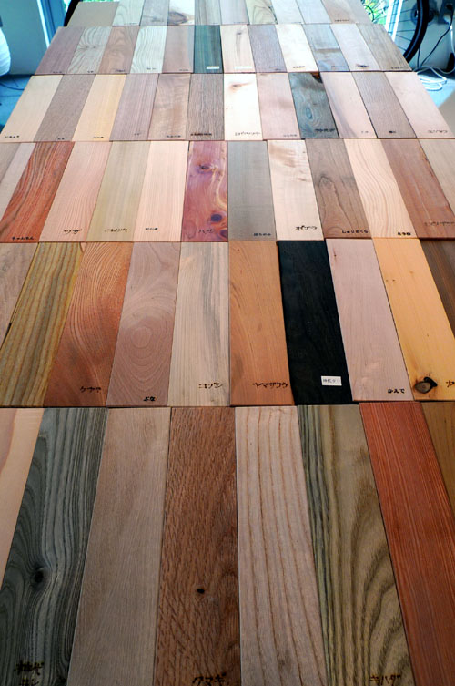 「日本の木」と銘打った=特徴と用途=整理表つき。これは有賀さんが実際に使った木の体験を通して作られた手づくり表です。それぞれ特徴や性質が違いますし、それを踏まえた用途として活かさねばなりません。