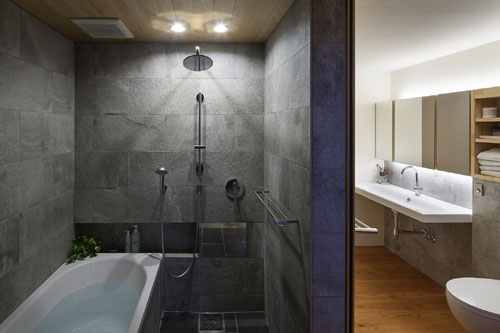 出入口は、水に強い青森ヒバで框を作ったガラス引戸。引戸なので、開け放しておいても邪魔にならず、洗面室と一体感があります。天井も出入り口と同じく青森ヒバ。青森ヒバは香りが良く、精神安定、抗菌、防虫、消臭、脱臭効果があるのが特徴。タイルの割付を整え、水栓、ニップル、スライドバー、レインシャワー、フック、タオル掛け、鏡、ニッチといったアイテムを丁寧に設えています。
