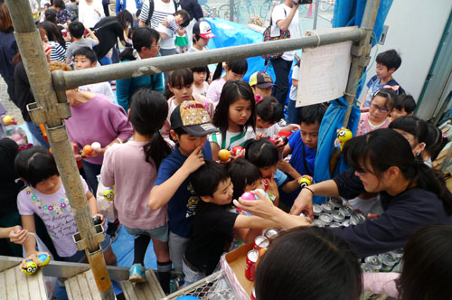 金のシールを貼った柔らかいボールを撒き、それを拾った人は当たり!