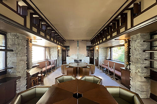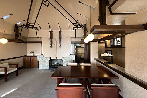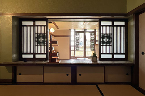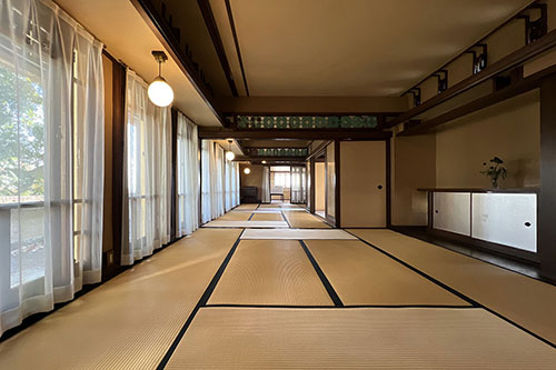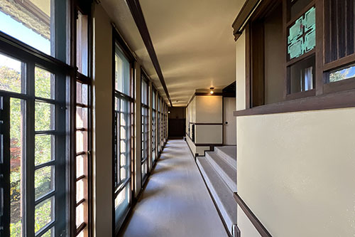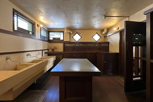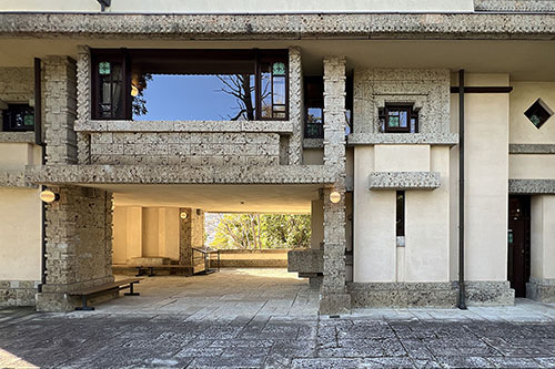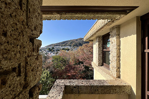 兵庫県芦屋市の小高い丘の上。灘の酒造家・山邑太左衛門の別邸として建てられた建築。フランク・ロイド・ライトの設計にて大正13年に竣工。現在はヨドコウ迎賓館(淀川製鋼所)となっています。車寄せを備えた玄関構え。ライトらしい大谷石の使い方が、建物の格式と柔らかさを感じさせます。2階に設けられた応接室の壁面には飾り棚や長椅子が作り付けられ、天井際の小窓から取り込む採光が独特。3階の廊下は大胆な開口部で、木のフレームや飾り銅板を通して木漏れ日のような光が差し込みます。飾り銅板は和室の欄間にも用いられ、和モダンな印象。傾斜地であることを活かしたスキップフロアの構成。廊下や階段空間には物入や長椅子、採光欄間が設えられた緩衝空間となっています。4階に設けられた食堂は天井が高く、装飾性の高いデザイン。奥にある厨房は機能的に設計されています。食堂からはルーフバルコニーに出られ、芦屋の街並みや海を一望できる絶景スポット。