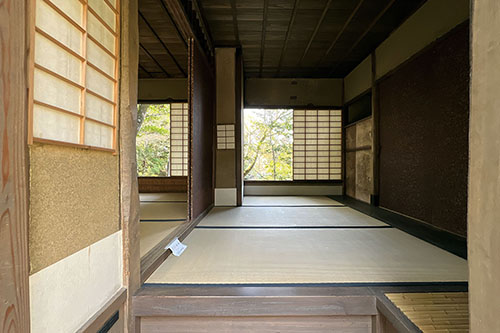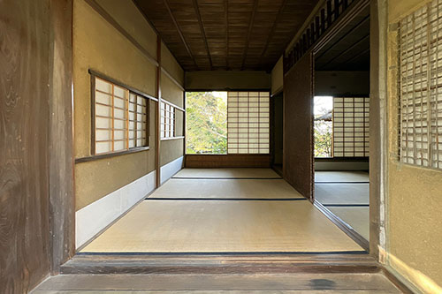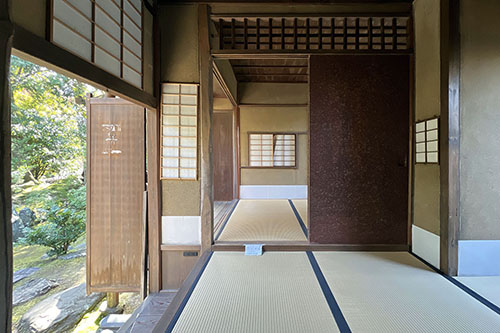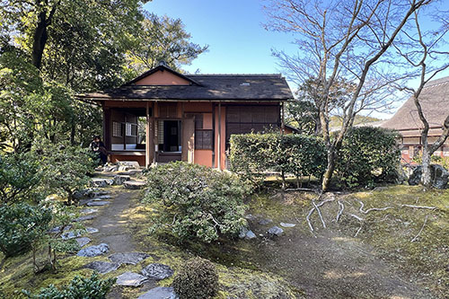 醍醐寺・三宝院庭園にある『枕流亭』が40年ぶりの特別公開。滝石組の高台にある茶室。創建は江戸中期以降と考えられているそう。露地庭空間からのアプローチ。外観は京錆と呼ばれる赤土に包まれています。上段の間、水屋の間、控の間の三室構成。上段の間には縁を設けた貴賓口から出入り。正客の前には床の間。床の相手柱に棕櫚が使われているのが珍しい。腰を下ろして左手に庭園を臨みます。風が抜けて気持ちが良い。水屋の間には落縁からの出入り。水屋流しが付き、洞庫流しがある地袋も有しています。控の間の外部正面にはバッタリ床几が揚げ店式に設けられているのがユニークで、大寄等の茶事に対応するためのものだそう。各室を仕切るのは朱漆揉紙の太鼓襖。これがまた美しく、空間を華やかに仕立てておりました。