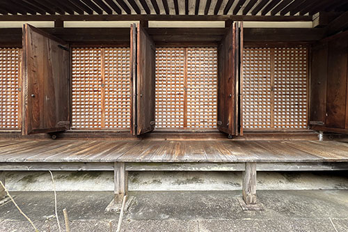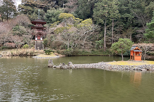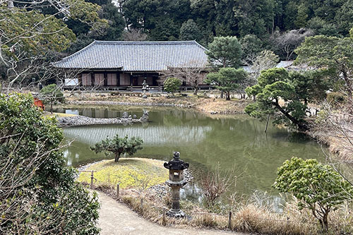 奈良方面を巡ってきました。家づくり学校の仲間たちとの修学旅行です。初めに向かったのは京都の最南端にある浄瑠璃寺。この辺りは、奈良の僧が世俗の喧騒を離れ、修養研鑽した場所。宝池を中心にした浄土世界。池の西側(彼岸)には本堂、東側(此岸)には三重の塔といった伽藍。どちらも国宝。本堂は桁行9間に、庇を回した全体11間。内部の写真撮影は禁止なのですが、九体の阿弥陀如来像が一間ごとに安置。四天王立像もふくめ国宝。山里の古寺に訪れた春。早咲きの桜が咲いておりました。見学後は茶屋で一服。私自身は集合時間よりも早めに行って、お昼も頂戴。山菜が美味い。おにぎり最高。